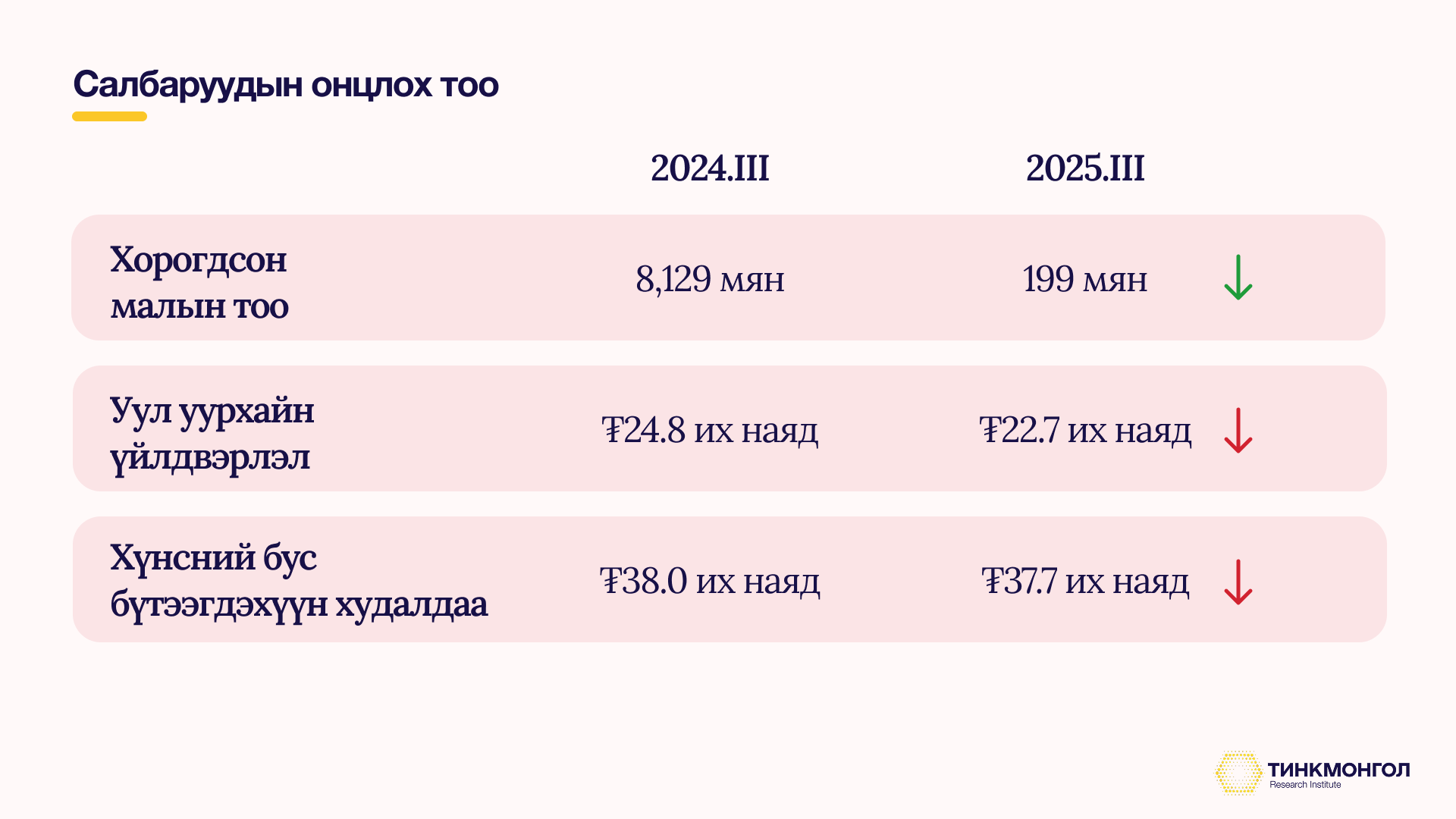 Хорогдсон малын тоо - 2024 онд 1990 оноос хойших 2 дахь хамгийн хүнд зуд, байгалийн гамшиг тохиолдож, 9.4 сая толгой мал хорогдсон. Үүний 8.1 сая нь эхний 9 сард хорогдсон байжээ. Харин энэ оны эхний 9 сарын байдлаар малын зүй бус хорогдол 41 дахин буурсан нь тус салбар эдийн засгийн өсөлтөд том нөлөө үзүүлэх үндэс болов.