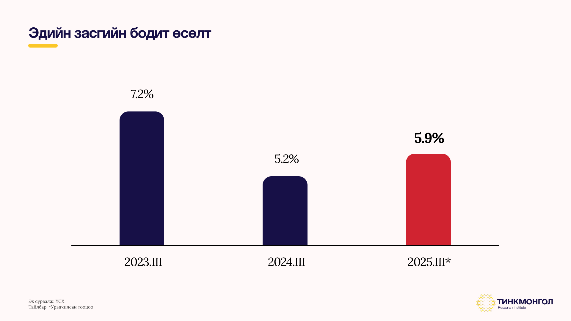 Хөдөө аж ахуйн суурийн нөлөөгөөр III-дугаар улиралд эдийн засгийн бодит өсөлт таамаглалаас өндөр байв. Харин дотоод, гадаадын төсөөлөл гаргадаг байгууллагуудаас жилийн эцэст Монголын эдийн засгийн өсөлтийг 5.1-5.9 хувийн орчимд байхаар төсөөлжээ.