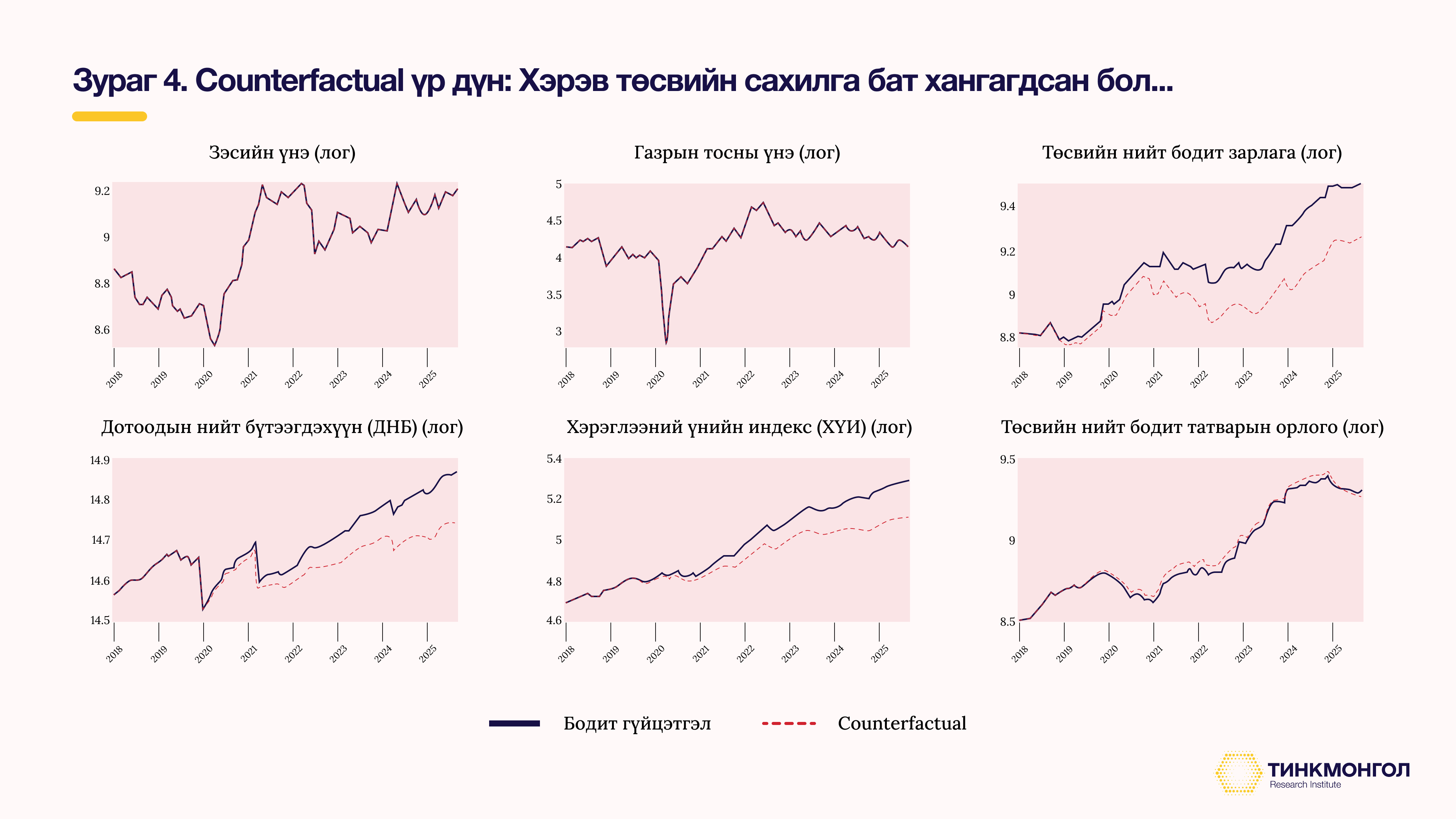 Дотоод эдийн засгийн бодлого, үйл ажиллагаа гадаад зах зээлд нөлөөлөхгүй тул зэсийн үнэ, газрын тосны үнэд өөрчлөлт орохгүй буюу эдгээрт гарсан шок, дотоод эдийн засагт өмнөхийн адил нөлөөлнө. Харин төсвийн сахилга баттай бодлого, бодит гүйцэтгэлийн зөрүүг Зураг 4-ийн эхний мөрний гуравдах баганад үзүүлэв. Хэрэв төсвийн нийт бодит зарлагыг энд харуулсан дүнгээр танаж чадсан бол, эдийн засгийн үндсэн үзүүлэлтүүд бодит гүйцэтгэл (хар зураас)-ээс хэрхэн ялгаатай байх байсныг цэнхэр тасархай зураасаар дүрслэн харуулсан болно.