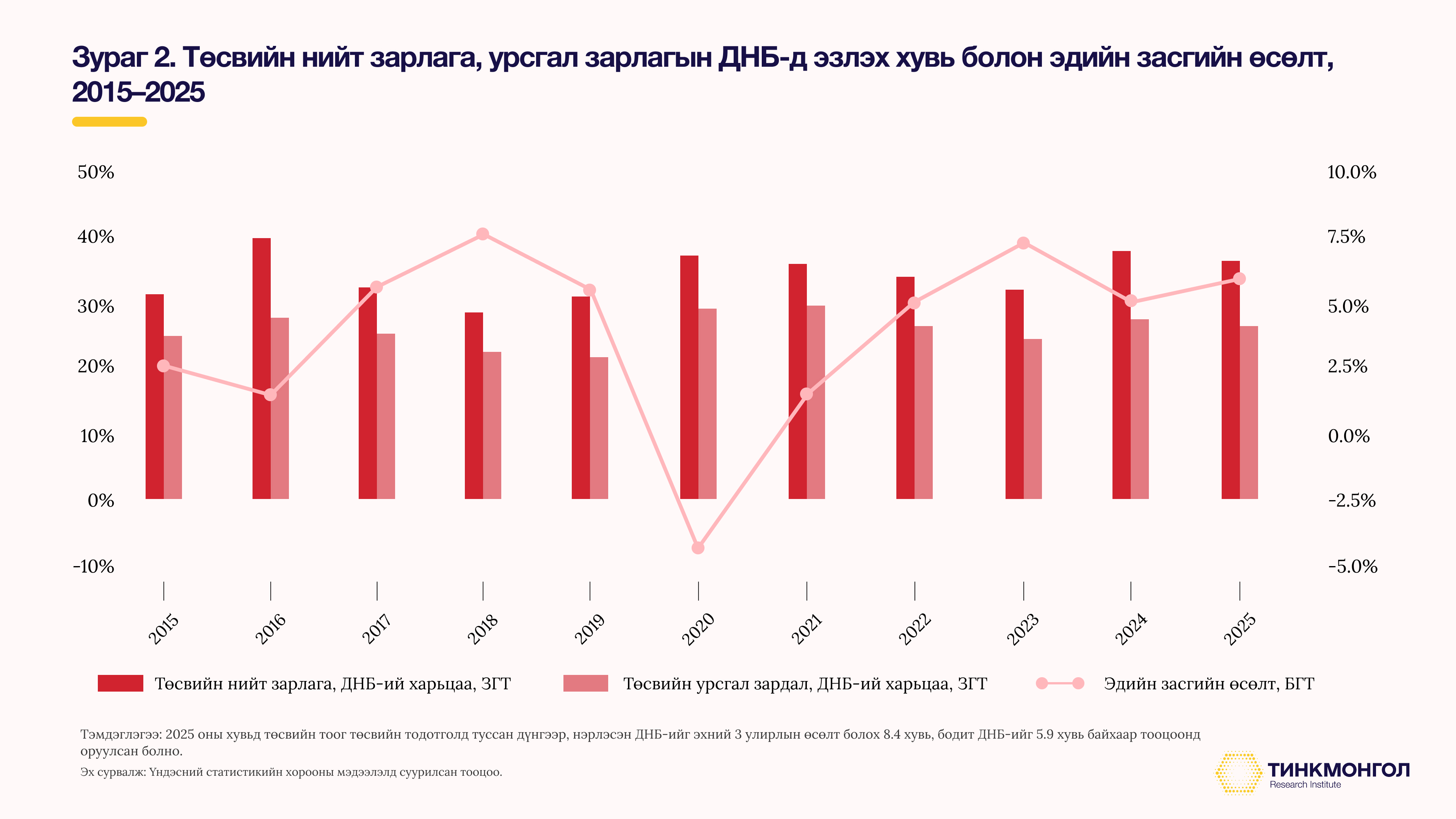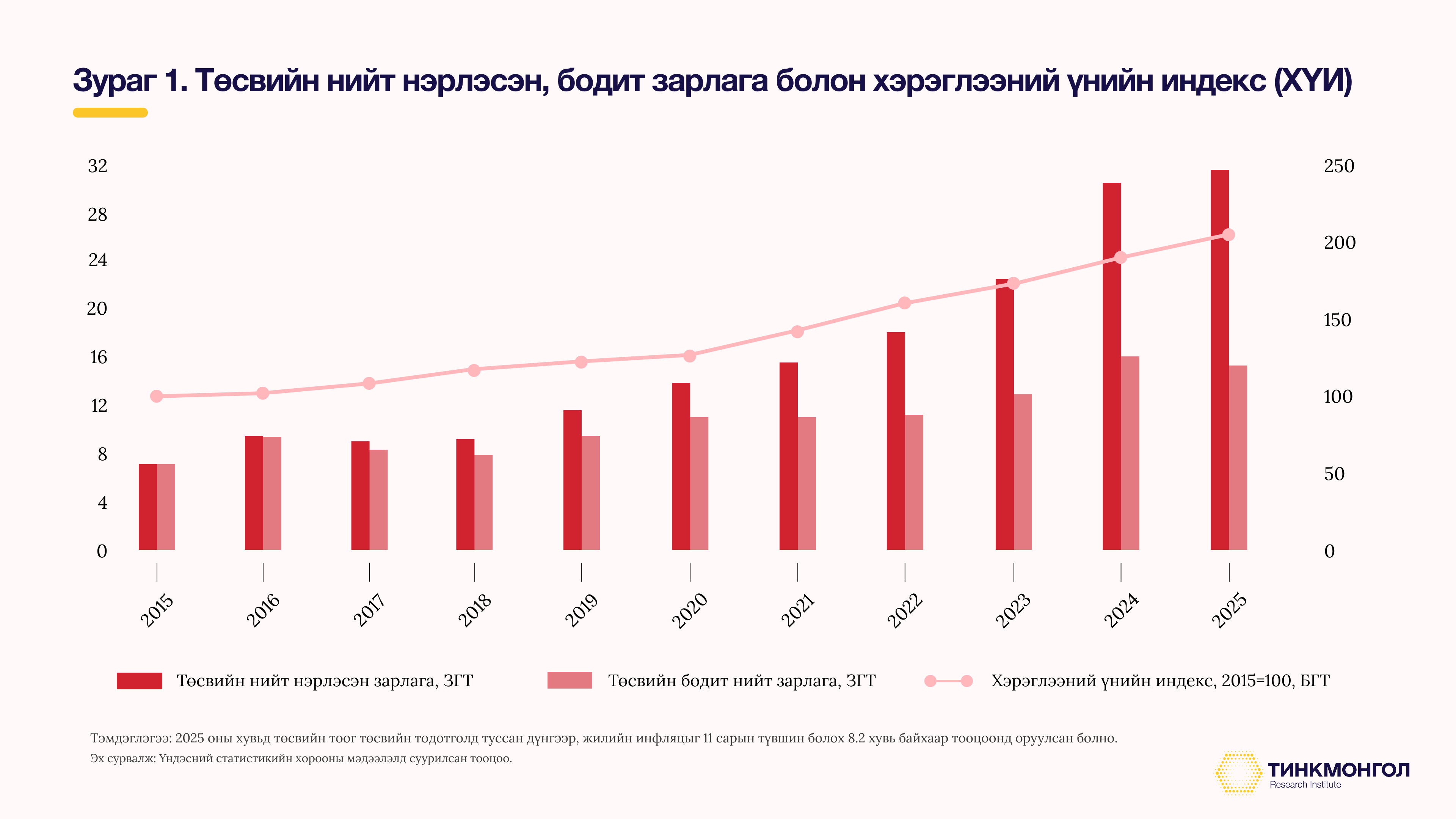 Төсвийн тэлэлттэй зэрэгцэн өргөн хэрэглээний барааны үнэ 2015-2025 оны хугацаанд 2 дахин, 2018-2025 онд 76 хувиар өссөн. Ийнхүү төсвийн зарлага, үнийн өсөлт хамт өсөж байгаа нь аль алиныхаа шалтгаан болж, “чөтгөрийн тойрог” үүсгэж байгаа юу гэдэг асуулт руу хөтөлнө. Өөрөөр хэлбэл, төсвийн тэлэлт нь урсгал зардал руу төвлөрч, дотоод эрэлтийг тэлж, хэрэглээ, импортыг санхүүжүүлснээр хэрэглээний үнэ өсөж, ханш сулрахад хүргэнэ. Нөгөө талдаа, бараа, үйлчилгээний үнэ өсөж байгаа нь төр ижил хэмжээний бараа, үйлчилгээг авахын тулд төсвийн нэрлэсэн зарлагаа нэмэгдүүлэхийг шаардах бол, нөгөө талдаа төсвийн нэрлэсэн орлогыг мөн өсгөх тул тэр боломжийг олгоно.