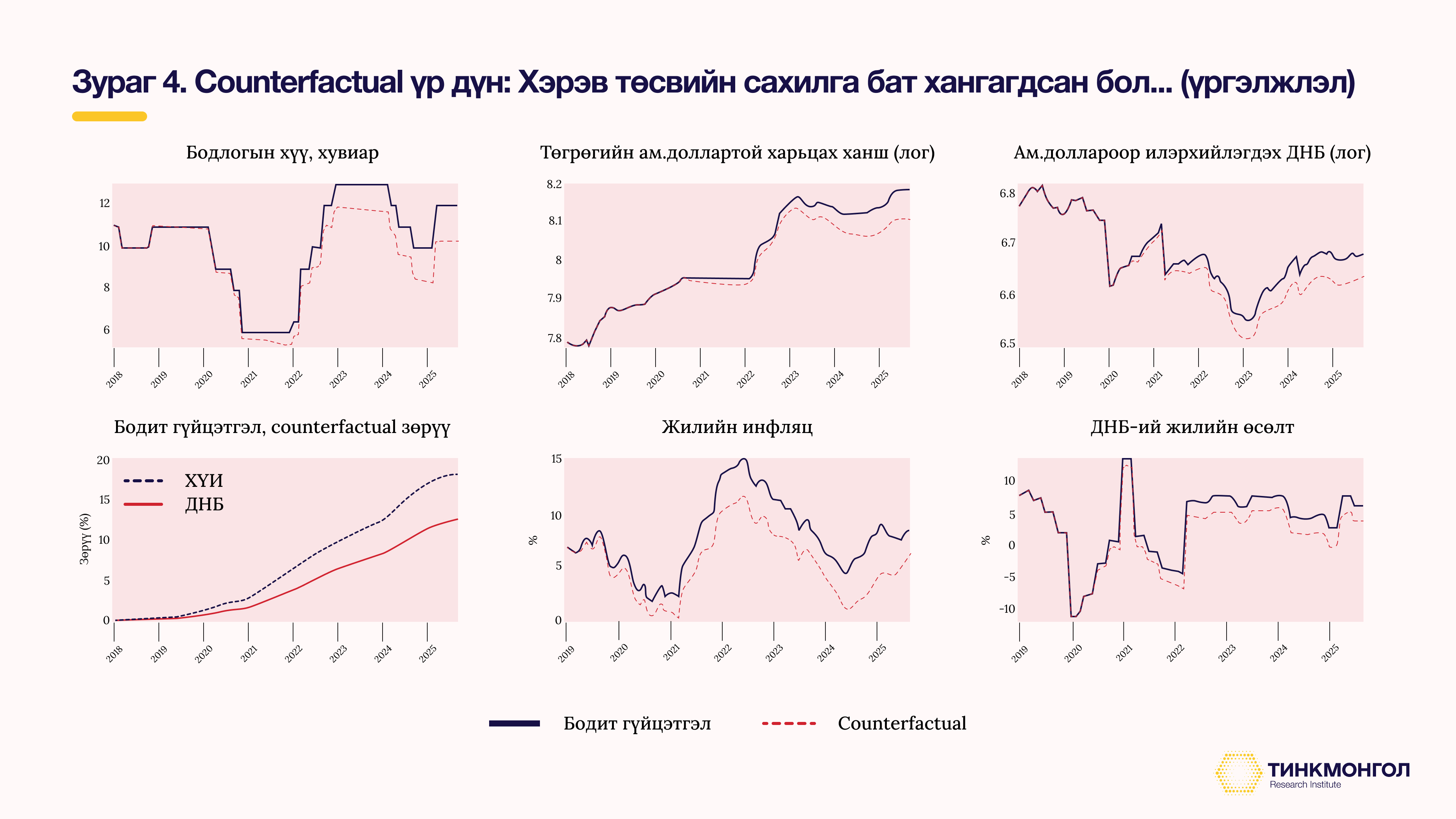 Төсвийн тэлэлтийн хэрэглээний үнийн өсөлтөд үзүүлсэн нөлөө илүү өндөр байжээ. КОВИД-19 цар тахлаас хойш төсөв огцом тэлж, мөнгөний бодлого зөөлөрч (бодлогын хүү 2021-2022 онд 6 хувь дээр байсан) эрэлтийг тэлээд байсан хөрсөн дээр газрын тосны үнэ 2021 оноос 2022 оны дунд хүртэл огцом өссөн (энэ нь манай эдийн засгийн хувьд нийлүүлэлтийн гадаад шок) нь хэрэглээний үнийн өсөлт хүчтэй, илүү удаан хугацаанд үргэлжлэхэд хүргэжээ. Өөрөөр хэлбэл, эрэлтийн өсөлт нь үнийн өсөлтөд хүргэхээс гадна, эрэлт байгаа үед нийлүүлэлт хомсдох эсвэл зардал өсөх нь үнийн өсөлтийг илүү тэтгэдэг процесс манай эдийн засагт явагдсан. Хэрэв төсвийн сахилга бат хангагдсан бол, манай эдийн засагт өргөн хэрэглээний бараа, үйлчилгээний үнэ одоо байгаа үнээс 18.1 хувиар хямд байх байжээ. Өөрөөр хэлбэл, жилийн инфляц 2021 оноос хойш бодит гүйцэтгэлээс 3.5-4.5 нэгж хувиар доогуур байх боломжтой байжээ. Ингэснээр инфляц 2023 оны 1 сараас хойш одоог хүртэл инфляцын зорилтын дээд хязгаар болох 8 хувиас бага байх, 2025 оны 9 дүгээр сарын байдлаар инфляц 9 хувь бус 6.5 хувь байхаар байжээ. Инфляц ийнхүү бага, зорилтот интервалд байх тул бодлогын хүүг бууруулах орон зайг бүрдэж, бодлогын хүү 2023 оноос хойш бодит гүйцэтгэлээс 2 нэгж хувиар бага байх буюу 2024 оны эцэст бодлогын хүү 10 хувь бус 8 хувь, харин одоо 12 хувь бус 10 хувь байх боломжтой байжээ. Өөрөөр хэлбэл, төсвийн тэлэлт нь инфляцаар дамжин мөнгөний бодлогыг хатуу төлөвт байхад хүргэж, бодлогын хүү, зээлийн хүүг өсгөж, улмаар хувийн хэвшилд сөрөг нөлөө үзүүлж байна.