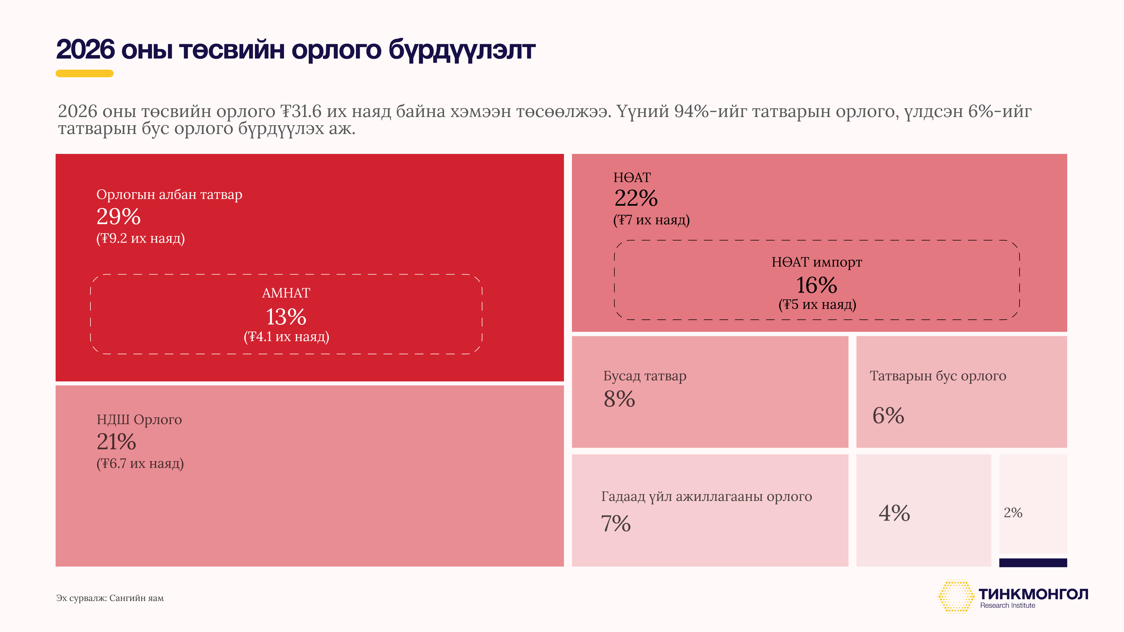 2026 онд НДШ, ОАТ, НӨАТ нийлээд төсвийн орлогын ойролцоогоор 73%-ийг бүрдүүлэхээр байгаа бол нийт татварын орлого төсвийн орлогын 94%-ийг бүрдүүлэхээр болоод байна. Орлогын бүрдэл дундаас хамгийн савлагаа өндөртэй хэсэг нь АМНАТ-ын орлого байдаг бөгөөд төсвийн орлогын 13%-ийг дангаараа бүрдүүлж буй тус орлогын тооцоололд эрдэс бүтээгдэхүүний үнийн төсөөлөл, биет хэмжээний төсөөлөл, дэлхийн түүхий эдийн эрэлт, тэр дундаа БНХАУ-ын эдийн засгийн идэвхжил чухал нөлөө үзүүлнэ.