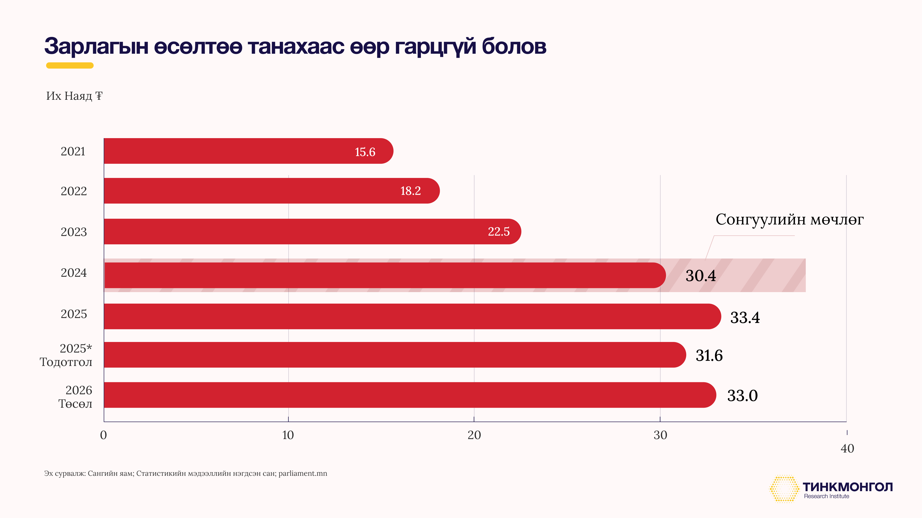 $60-$80-т зарж байсан чулуун нүүрсний үнэ цойлж 2021 онд $176, 2022 онд $205-т хүрсэн нь дараагийн жилүүдэд нь өндөр орлого, түүнийг дагасан өндөр зарлага төсөөлөх шалтгаан болов. Түүхий эдийн үнийн өөдрөг төсөөлөл, УИХ-ын сонгуулийн мөчлөг давхцаж, 2024 онд ₮30 их наяд зарлагатай төсвийг баталсан.